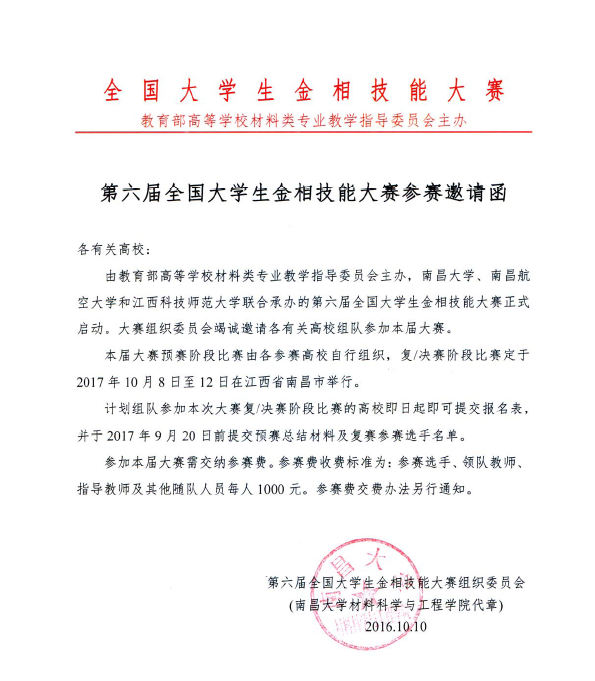 第六届全国大学生金相技能大赛将于2017年10月8日-12日在江西南昌举办。根据大赛组委会规定,所有代表各高校参赛选手必须通过校内预选赛方式进行选拔。现面向我校相关专业本科生组织开展第六届全国大学生金相技能大赛校内预选赛。通过校内预选赛最终选拔出三名优秀学生代表我校参加本届全国大学生金相技能大赛。有意参赛的学生请联系学委以班级为单位统一将报名名单和报名表(电子版)报至黄色网 教管部宋辉老师处(电话:13086287705,邮箱:[email protected]),截止日期:2017年5月27日。校内预选赛具体组织安排待后续通知。