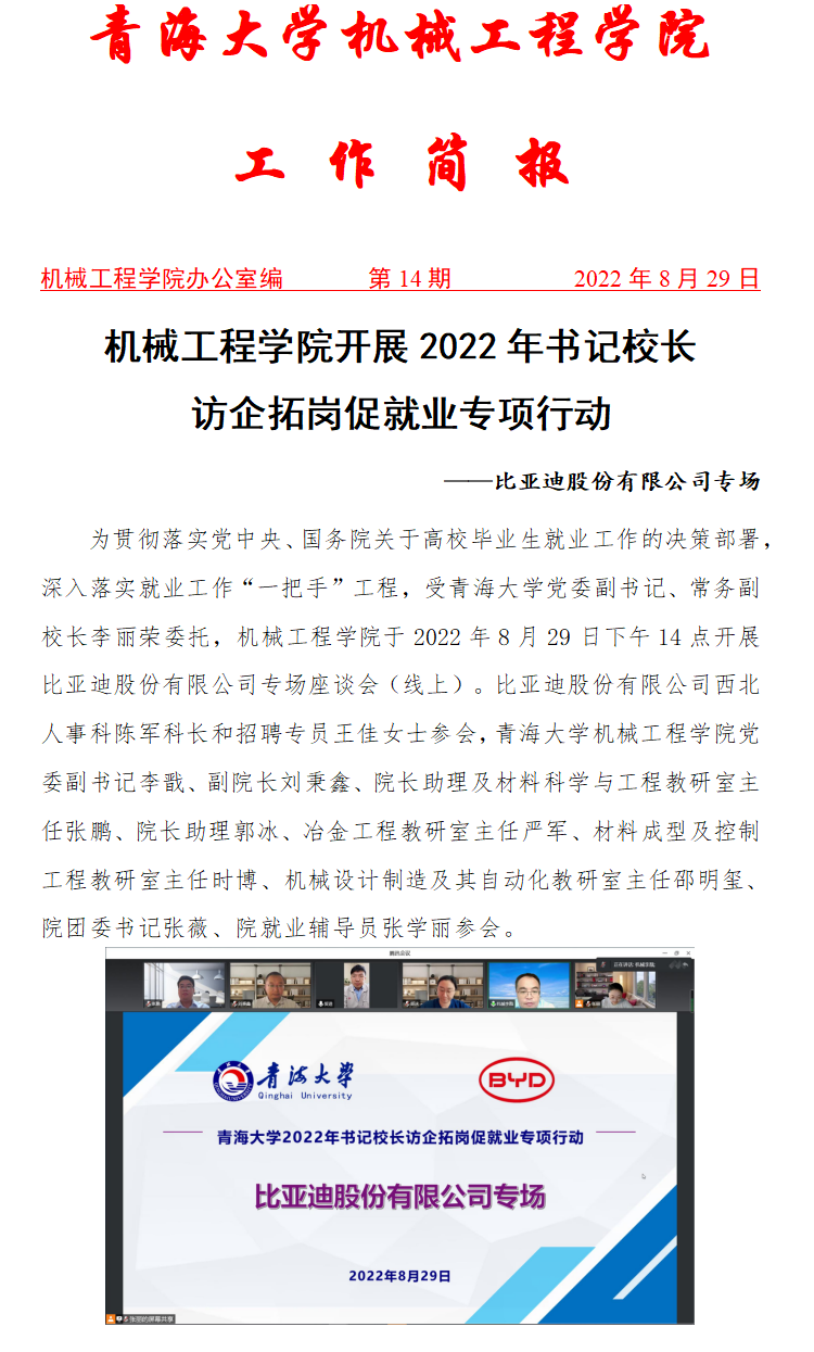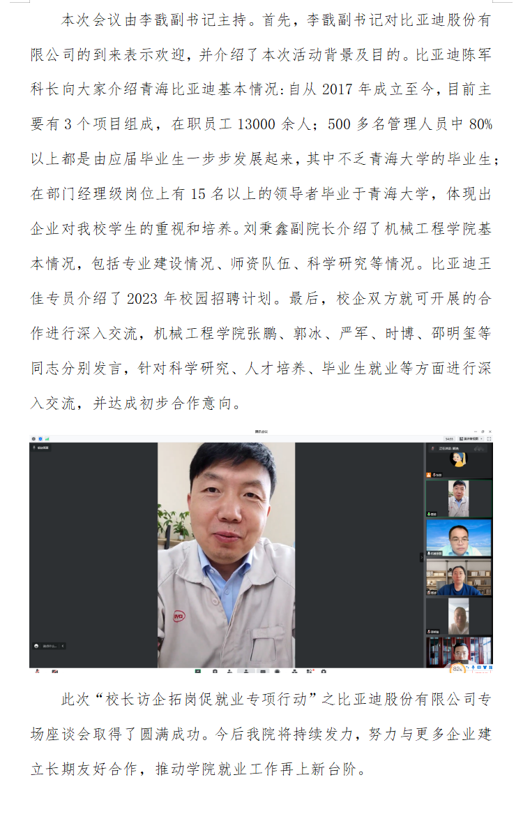 黄色网 开展2022年书记校长访企拓岗促就业专项行动 ——比亚迪股份有限公司专场